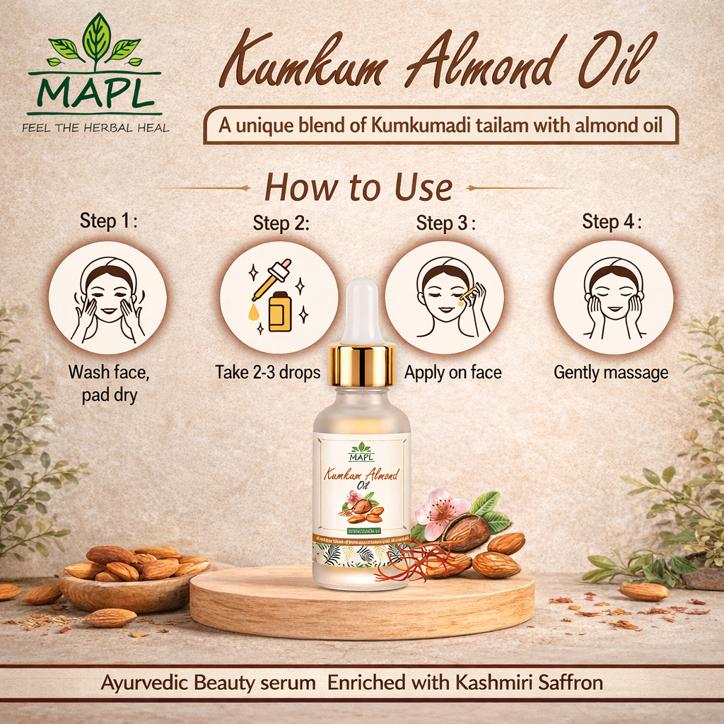 MAPL Kumkum Almond Oil is inspired by the traditional Ayurvedic Kumkumadi Oil and enhanced with nourishing Almond Oil to deliver a more potent, fast-absorbing face serum. This luxurious blend of saffron, almond oil, and Ayurvedic herbs helps restore natural glow, even skin tone, and healthy radiance.